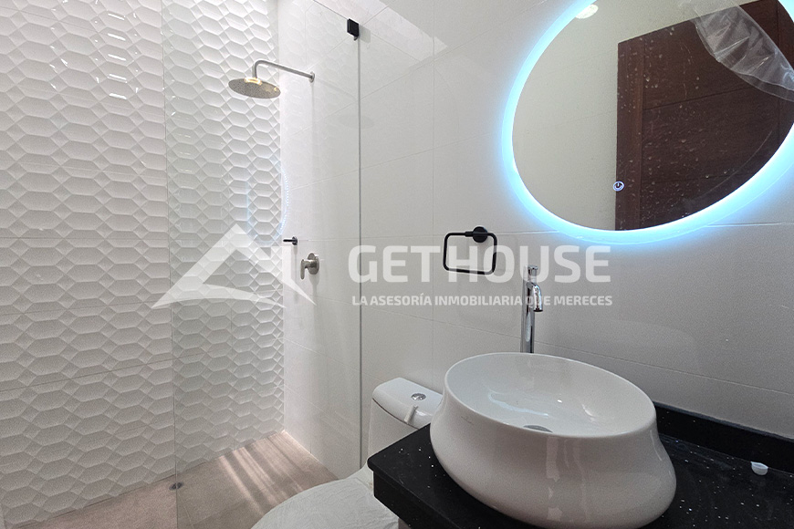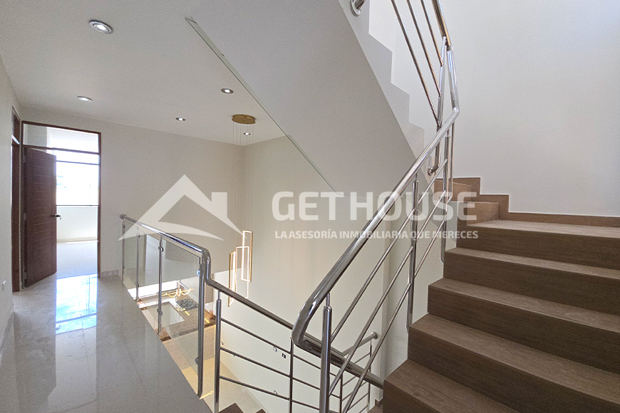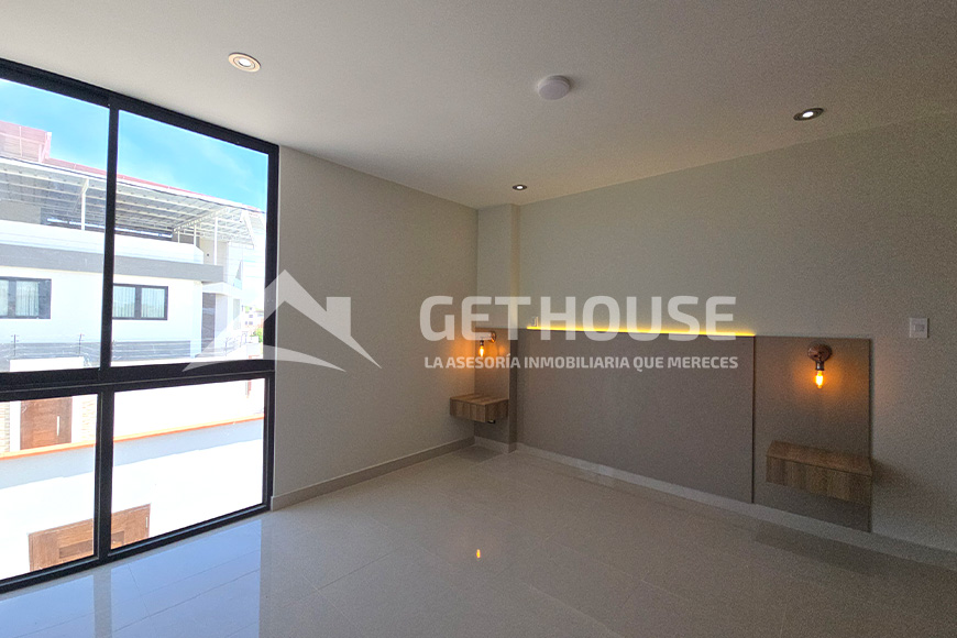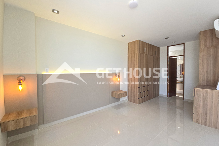 Segundo piso: Habitación principal con cabecera, walk-in closet, balcón y baño privado, 2 habitaciones secundarias con closet y baño privado.