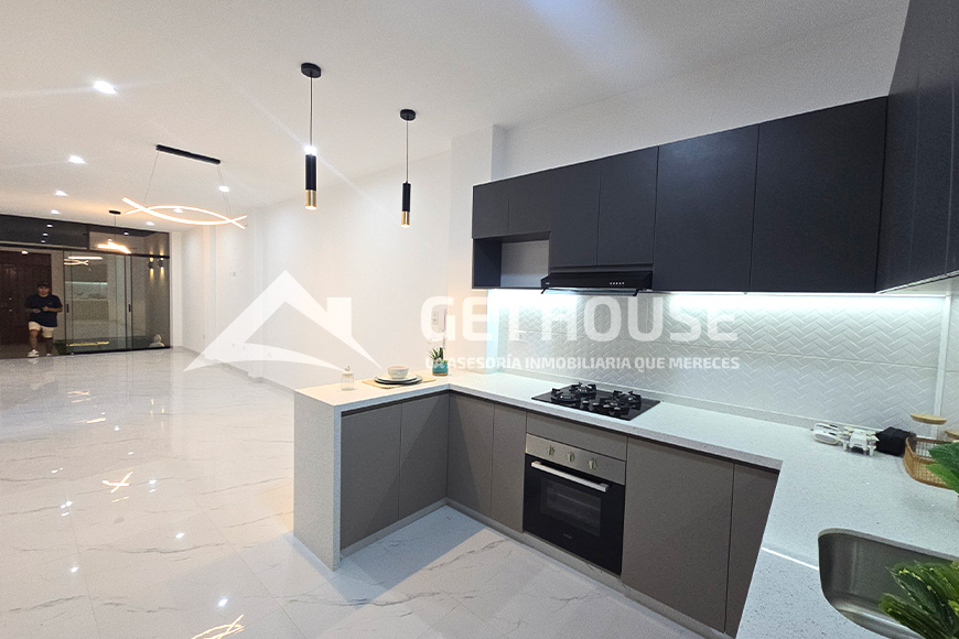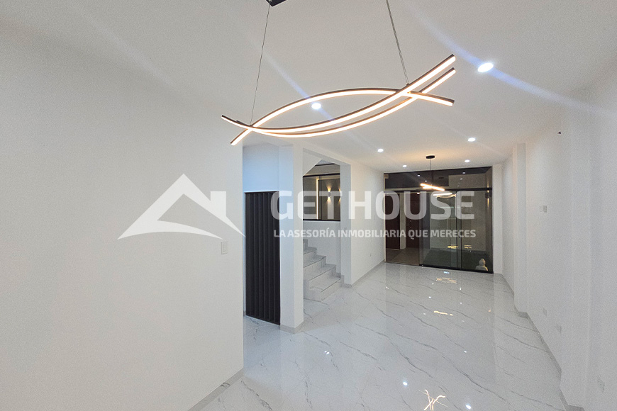 Primer piso: amplia cochera, acogedora sala-comedor, moderna cocina americana, terraza, una habitación y baño completo.