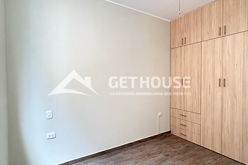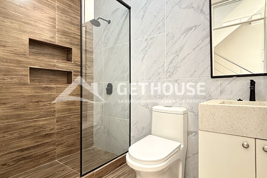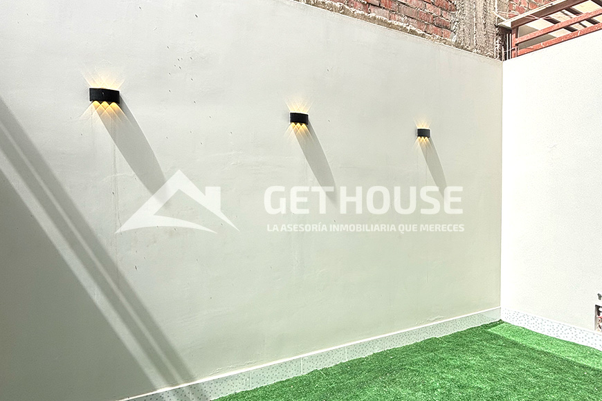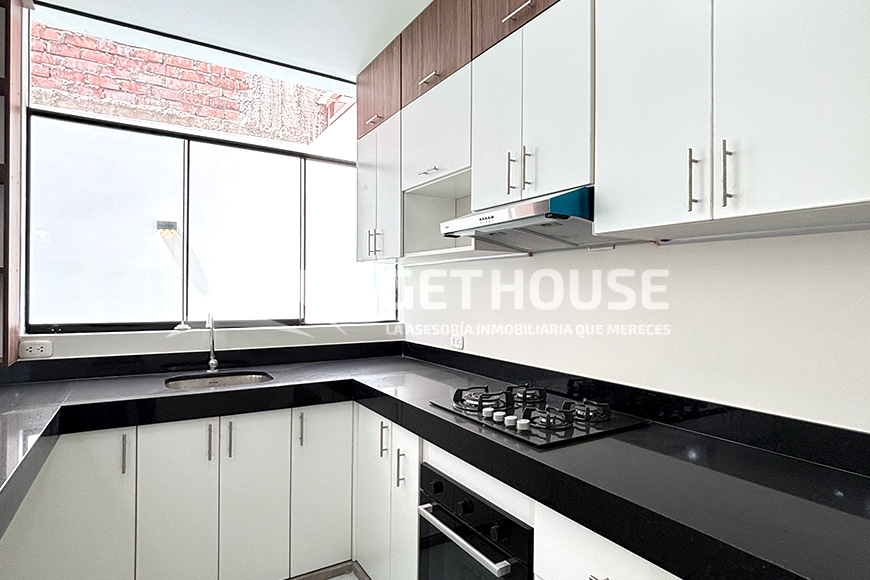 Amplia sala-comedor, baño de visitas, moderna cocina equipada (encimera, horno y campana), patio posterior y estacionamiento.