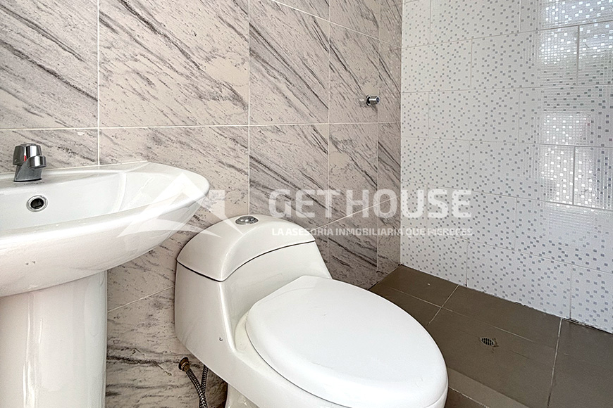 Habitación de servicio o visitas, baño completo y zona social con piscina y parrilla.