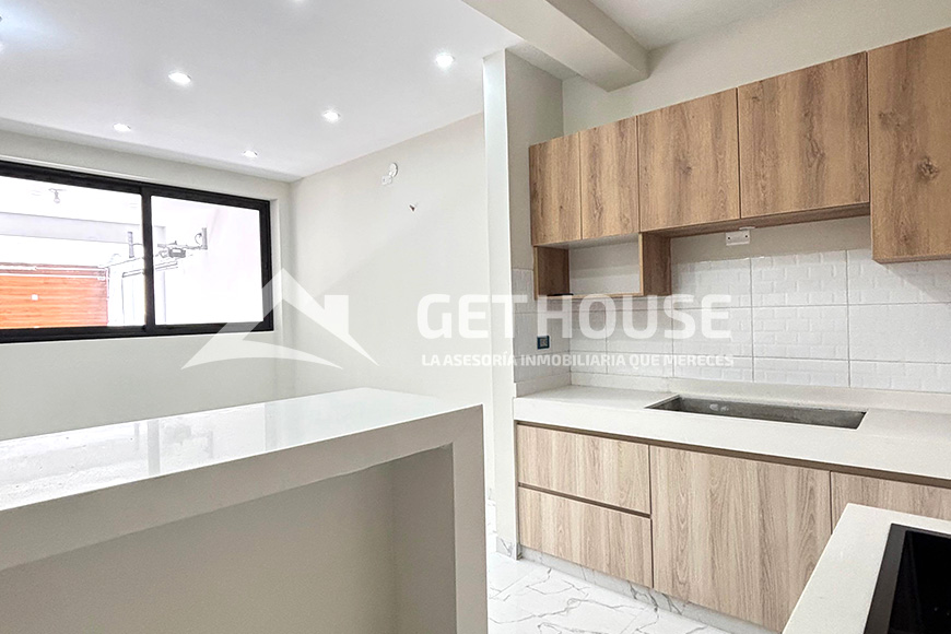 • Cocina moderna con mesada de cuarzo, reposteros altos y bajos, y cocina encimera de 4 hornillas